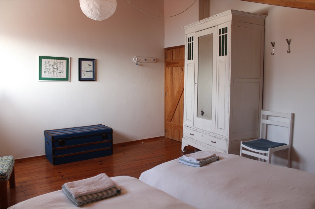 Quarto espaçoso com uma cabeceira de cama reciclada com calças de ganga. Perfeito para dois companheiros de viagem.